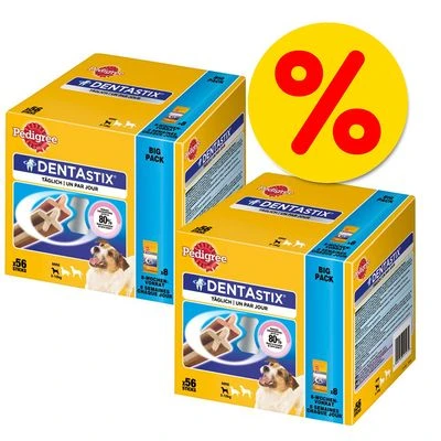 Profiteer vandaag nog! Sla voordelig Pedigree Dentastix in met dit mega pakket van 112 stuks! Deze kauwsnack verzorgt het gebit van je hond.
