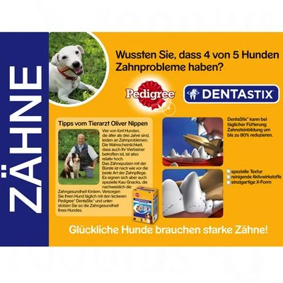 Pedigree Dentastix zijn de passende oplossing om de tanden van uw hond gezond en krachtig te houden. De Dentastix onderhouden de tanden heel eenvoudig tijdens het kauwen.