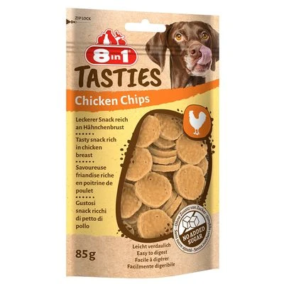 8in1 Tasties Kippenchips worden bereid met heerlijke kipfilet en is glutenvrij. Ze bevatten weinig vet en zonder extra toevoegingen zoals smaakversterkers, toegevoegde suikers of conserveringsmiddelen. De snacks zijn geschikt voor alle hondenrassen. Het hersluitbaar zakje met ritssluiting maakt het een ideale keuze voor onderweg.