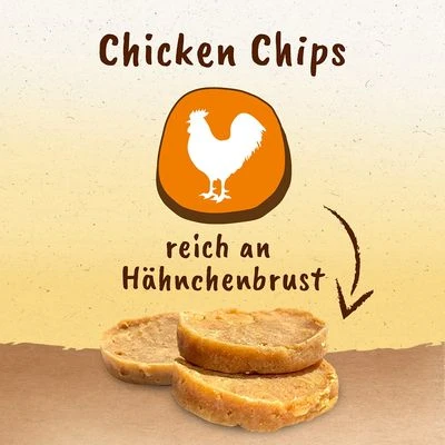 Krokante hondensnoepjes, ronde chipvorm, recept met veel kip, vetarm, glutenvrij, licht verteerbaar, zacht gegaard in de oven, zonder toevoegingen, ideaal als beloning tussendoor, goede acceptatie