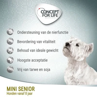 De hoogkwalitatieve droogvoeding van Concept for Life mini senior is volgens wetenschappelijke bevindingen speciaal voor volwassen, oudere honden van kleine rassen vanaf 8 jaar ontwikkeld: