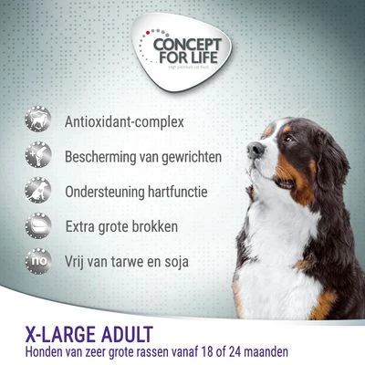 Concept for Life is een uniek, wetenschappelijk gefundeerd voedingsconcept voor een hondenleven in optimale gezondheid. De variant X-Large Adult biedt volwassen honden van reusachtige rassen vanaf de 18e of 24e levensmaand een evenwichtig voer dat speciaal op hun behoeften in afgestemd.