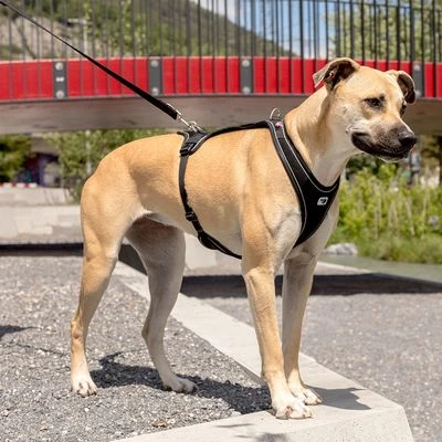 Robuust zwart Y-tuigje voor honden. Materiaal: polyester. 3D Comfort Fit. Goede pasvorm. Gevoerd handvat. Verstelbare borstriem. Geen verstikking. Met DogFinder ID. 2 hondenlijnbevestigingen mogelijk.