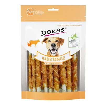 Dokas Kauwstaven met Kippenborst zijn heel bijzonder kauwplezier, waar iedereen enthousiast van wordt. Knapperige staven uit runderhuid zijn met geselecteerde en hoogwaardige kippenborstrepen omwikkeld en stimuleren tot intensief kauwen. Daardoor kunnen de kauwspieren en het gebit worden gesterkt. De kippenborst zorgt tevens voor een heel bijzondere smaakervaring, dat iedere hond, groot of klein zal overtuigen! Omdat deze snacks vrij van graan of kunstmatige additieven zijn, zijn ze ook uitstekend geschikt voor voedselgevoelige honden. Het vetaandeel van de kauwstaven is met 3,8% zeer laag. De Dokas Kauwstaven met Kippenborst zijn de ideale bezigheid of gewoon een welkom tussendoortje! De hersluitbare zak zorgt ervoor, dat de snacks lang vers blijven.