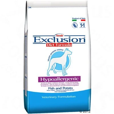Exclusion hondenvoer met vis & aardappel werd speciaal ontwikkeld voor honden met allergieën en onverdraagzaamheden alsmede voor de behandeling van, en ter voorkoming van huidstoornissen. Het gebruikte ruwe materiaal komt van noordzeeharingen, die zich onderscheiden door een hoog gehalte aan Omega-3-vetzuren, deze ondersteunen en bevorderen het helen van huidontstekingen. De haringen worden op hoogzee gevangen en zijn derhalve niet met industriële stoffen in aanraking geweest, zoals gebruikelijk bij gekweekte vissen.