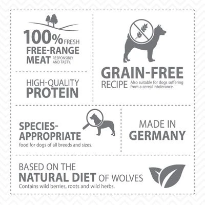 - Voeding voor volwassen honden van alle rassen en groottes gebaseerd op de voedingsgewoonten van de wolf in het wild