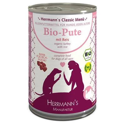 Herrmann’s Hondenvoer Menu is een bijzonder hoogwaardig compleetvoer voor honden – met gecertificeerde biokwaliteit. Het bio-vlees dat gecontroleerd biologisch gefokt wordt, komt direct van de boerderij.Het bio-vlees wordt op een diervriendelijke manier gefokt en geslacht. Herrmann’s Bio-Menu met licht verteerbare koolhydraten en extra groenten is lekker compleetvoer voor elke hond – kant en klaar uit blik.