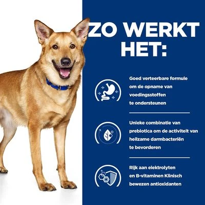 Hill’s Prescription Diet biedt een serie aan voer aan, dat kan wordt gebruikt om uw dieren met verscheidene ziekten te behandelen. Met klinisch bewezen effect. Hill’s Prescription Diet Canine i/d is speciaal ontwikkeld voor honden die lijden aan gastro-intestinale ziekten. Maar ook bij de regeneratie na een operatie of ernstige ziekte, waardoor uw hond verzwakt is, kunt u dit voer geven. In het voer zitten hoogwaardige ballaststoffen, die de cellen van de darmwand voeden. Daarnaast bevat het een speciaal antioxidantencomplex, dat de schadelijke, vrije radicalen kan neutraliseren. Doordaat het recept eenvoudig te verteren is, kunnen zelfs honden met een zeer sensibel verteringsstelsel het voer goed verdragen.