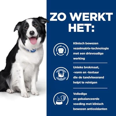 Prescription Diet Canine t/d Dental Care van Hill´s werd speciaal ontwikkeld om de gebitsgezondheid van uw volwassen hond te ondersteunen. Het compleetvoer bevat een innovatieve vezelmatrix-technologie, dat het tandoppervlak reinigt. Daarbij reduceert het klinisch bewezen de vorming van tandsteen en -verkleuring. Tevens bestrijdt het bacterieel tandaanslag. Zo draagt de speciaalvoeding bij aan langdurige mondhygiëne van uw hond en kan slechte adem verminderen.