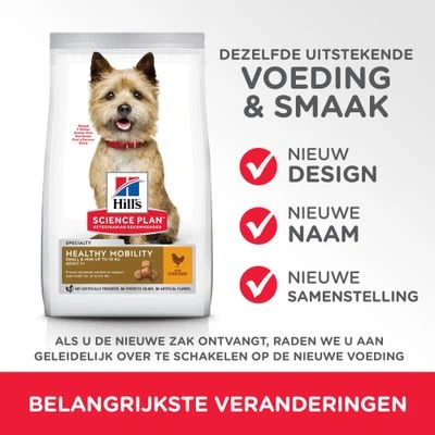Hill’s Science Plan Adult 1+ Healthy Mobility Small & Mini met Kip is volwaardig, evenwichtig droogvoer dat speciaal ontwikkeld is voor volwassen honden van kleine rassen. Het voer bevat EPA uit visolie, glucosamine en chondroïtine. Dat zijn ingrediënten die de natuurlijke mobiliteit en de gewrichtsgezondheid van je hond kunnen ondersteunen.