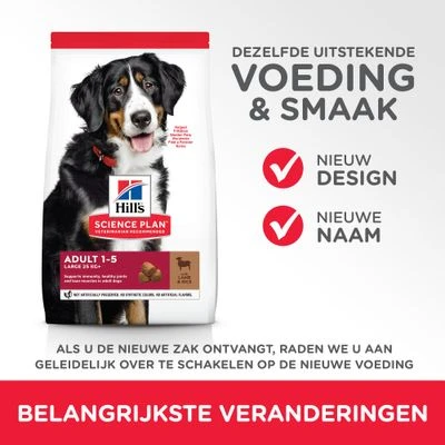 - Hill’s Science Plan Adult 1-5 Advanced Fitness Large Breed Lam en Rijst is ontwikkeld om aan de behoeften van honden tussen één en vijf jaar en met een gewicht van meer dan 25 kg te voldoen. Hele grote rassen met een gewicht van meer dan 50 kg bereiken de leeftijd senior al bij een leeftijd van 5 jaar