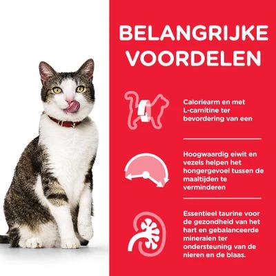 Hill’s Science Plan Mature Adult 7+ Active Longevity Light kattenvoer is aangepast aan de behoefte van volwassen katten die minder calorieën nodig hebben en vanwege bijvoorbeeld minder activiteit, castratie of andere omstandigheden tot overgewicht neigen.