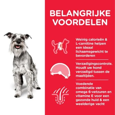 - Hill’s Canine Mature Adult 7+ Light Mini heeft weinig calorieën en het lage vetgehalte kan oudere honden, met de neiging tot overgewicht, helpen hun ideaalgewicht te behouden.