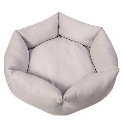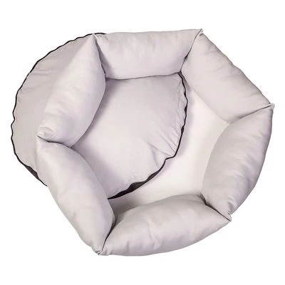 Zeshoekig hondenbed met extra hoge rand. Comfortabele voering. Geïntegreerd ligkussen. Antislip onderkant. Chique ontwerp met stoffen hoes. Wasbaar. Kleur: lichtgrijs.Â