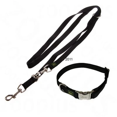 Nu verkrijgbaar als voordelige set: zwarte hondenhalsband met Alu-Strong sluiting en bijpassende verstelbare lijn van nylon uit de Hunter Vario Basic serie. Kleur: zwart