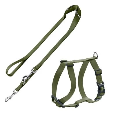 Bespaar nu! Olijfgroene set met tuig en riem voor honden. Polyester. Tuig met veiligheidssluiting. Reeks London voor honden. Slijtvast. Drievoudig verstelbare lijn. Kwalitatief.