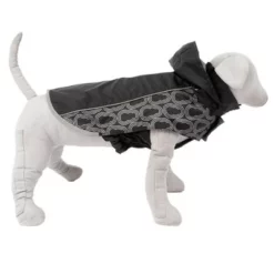 Zwarte regenjas voor honden met reflecterend KONG-design. Waterafstotend. Handige capuchon, 2-weg deelbare ritssluiting. Klittenbandsluiting & elastieken. Elastisch rondom borst en buik.