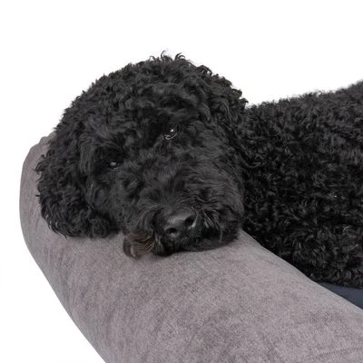 Zacht gevoerde hondenmatras met dikke zijranden en orthopedisch traagschuim, vormt zich naar het lichaam en ontlast de gewrichten, hoes van hoogwaardige meubelstof, kleur: grijs/zwart.