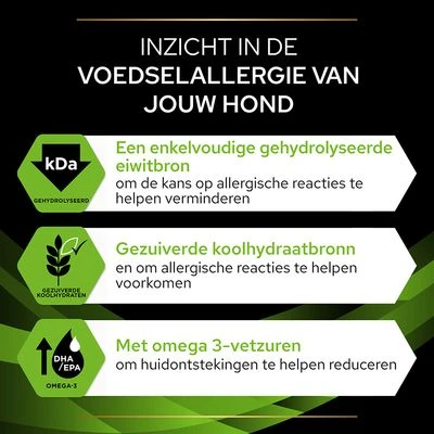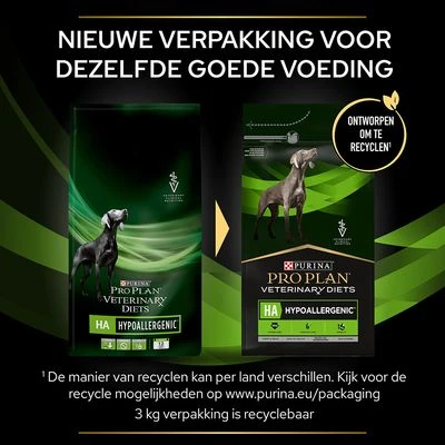 Purina Pro Plan Veterinary Diets – HA Hypoallergenic hondenvoer is compleet droogvoer speciaal samengesteld voor honden met voedselallergie. Voedselallergie kan vaak huid of spijsverteringsproblemen veroorzaken. De hond krabt zich vaak, heeft een rode huid of infecties. Wellicht braakt de hond regelmatig of heeft hij last van diarree. De dierenarts zal proberen vast te stellen of de hond aan voedselallergie lijdt. Dit betekent vaak een uitsluitdieet – een dieet, met als doel om geen reacties uit te lokken.