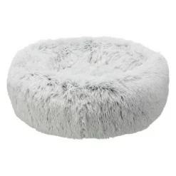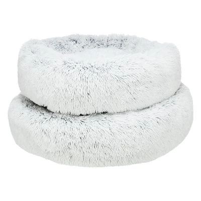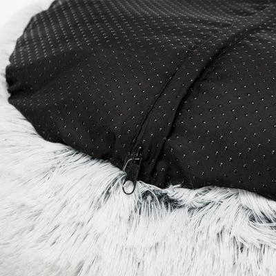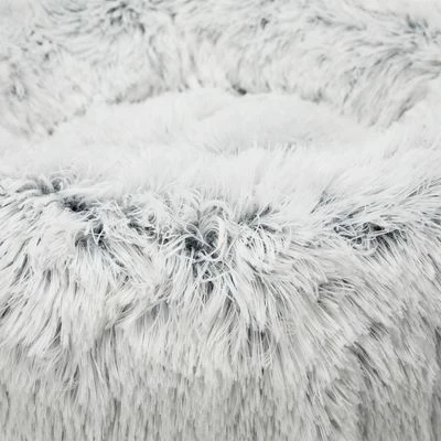 Rond ligkussen voor honden. Extra donzige, lange pluchen hoes. Hoes kan in de wasmachine. Antislip onderzijde. Dik gevoerd voor hoog comfort. Met vastgenaaid kussen. Kleur: wit/zwart.