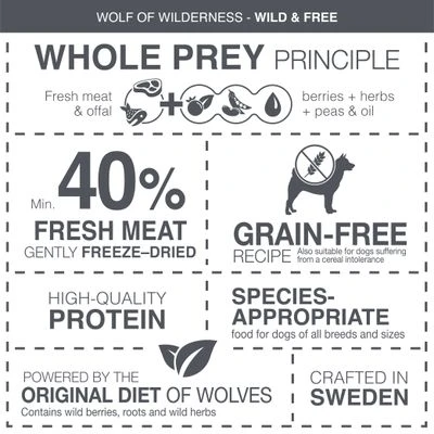 Wolf of Wilderness is een soortspecifiek hondenvoer dat is gebaseerd op de oorspronkelijke voeding van de wolf in het wild. Naast veel vers vlees bevatten de graanvrije recepten bosbessen, wortels en wilde kruiden. Wild en puur. Wild and free.