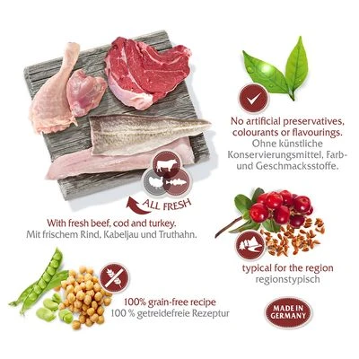 Gebalanceerd hondenvoer met vers vlees van rund, kabeljauw en kalkoen, geheel vrij van granen en aangevuld met veenbessen. Afgestemd op de oorspronkelijke behoeftes van de wolf.