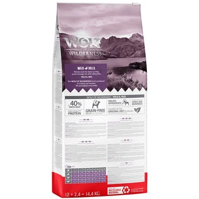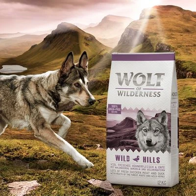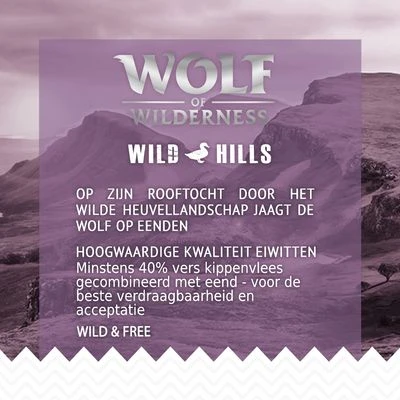 Wolf of Wilderness “Wild Hills” compleetvoer, aangepast aan het oorspronkelijk voer vande wolf, graanvrij, met 61% kippen- en eendenvlees, verrijkt met wilde kruiden, bosbessen en wortelen.