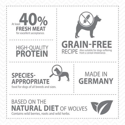 - Gebaseerd op de eetgewoontes van de wolf in de wildernis: voor honden van ieder ras en iedere grootte.